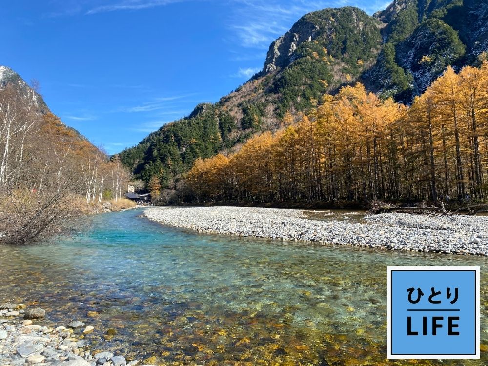 透き通った梓川、黄金に輝くカラマツ、目を見張るような青空。
